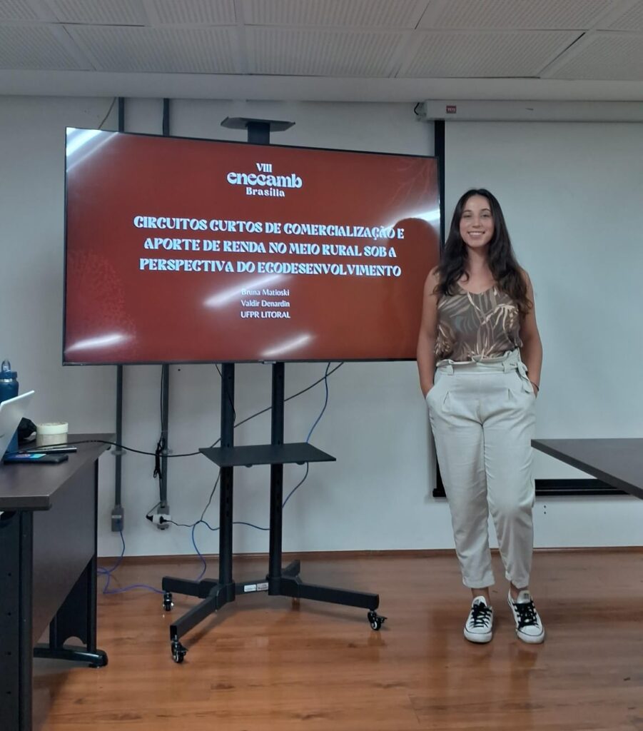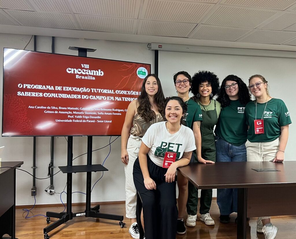Dos dias 13 à 22 de julho de 2024, na cidade de Brásilia-DF, ocorreu o VIII Encontro Nacional de Estudantes de Ciências Ambientais (ENECAMB), contando com a participação de 6 integrantes do PET CC, que levaram como objetivo central da viagem a apresentação de trabalhos desenvolvidos pelo PET, promovendo a integração das petianas do curso de ciências ambientais no cenário nacional, e estabelecendo conexões e trocas de saberes com outros estudantes dos mais diversos cursos de ciências ambientais presentes no país. Assim, foram apresentados dois trabalhos relacionados ao PET Comunidades do Campo, sendo eles: “Circuitos Curtos de comercialização sob a perspectiva do ecodesenvolvimento” com a autoria de Bruna Matioski; e “O Programa de Educação Tutorial Conexões de Saberes Comunidades do Campo em Matinhos, PR”, com a autoria das petianas: Ana Caroline da Silva, Bruna Matioski, Gabriela da Silva Belmonte Rodrigues, Giovana Gritten de Assumção, Manuela Skonieski e Sofia Amaro Ferreira. Além de palestras e oficinas, o eventou contou com uma viagem para Colinas do Sul, GO, onde as participantes tiveram uma vivência no cerrado e interagiram com moradores locais. No dia 20/07, durante a plenária de encerramento, todos avaliaram o evento e votaram para decidir a próxima sede, onde a Universidade Federal do Paraná (UFPR) foi escolhida, recebendo 29 votos, em comparação com 23 da Universidade Federal de Minas Gerais (UFMG). Após a chegada das integrantes na cidade de Matinhos, no dia 01/08, os estudantes se reuniram com colegas de Ciências Ambientais para compartilhar experiências e ressaltar a importância do evento para sua formação, além de incentivar a participação ativa no próximo ENECAMB na UFPR Litoral.